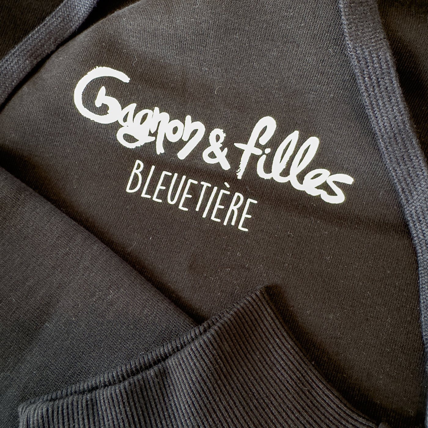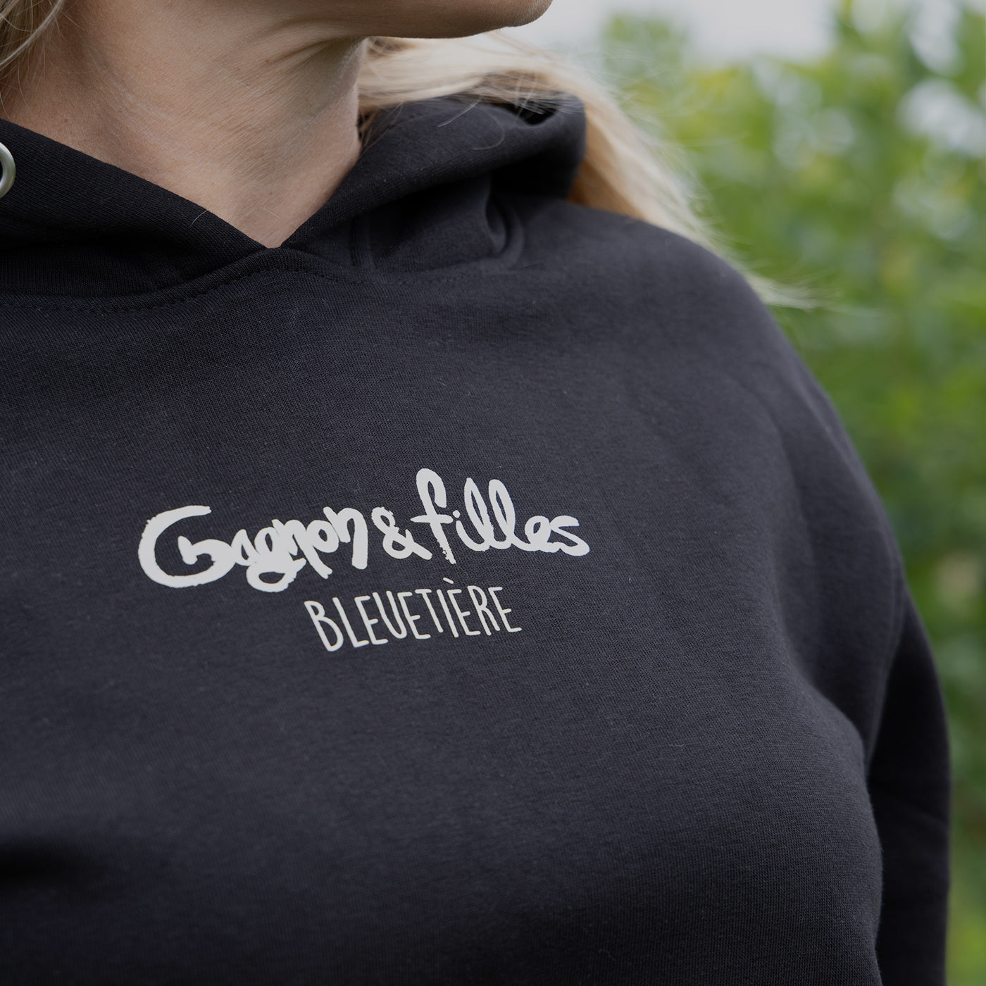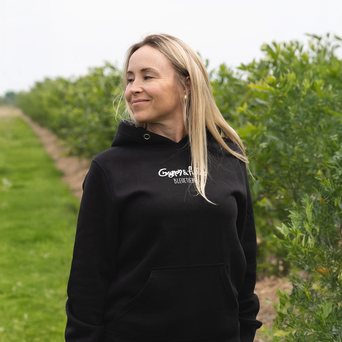 Ce hoodie noir, avec son logo discret de la Bleuetière Gagnon et filles, rappelle l’élégance tranquille des souvenirs d’été.